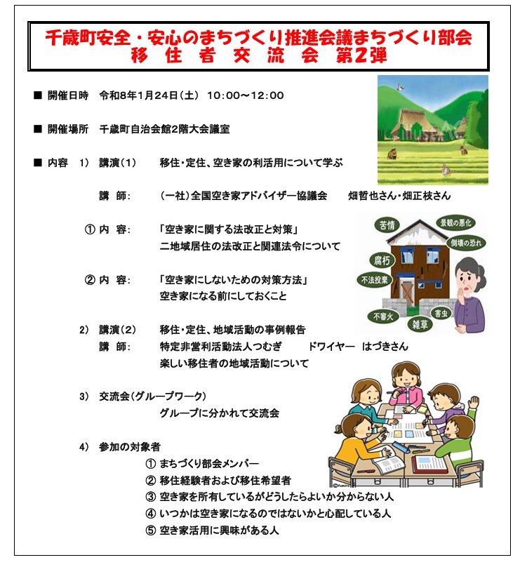 2025-12-25 / 最終更新日時 : 2025-12-25 chitose 未分類 【お知らせ】第2回移住者交流会を開催します 令和8年1月24日(土)10:00~12:00に、「第2回移住者交流会」を開催します。移住をお考えの皆様の参加をお待ちしています。