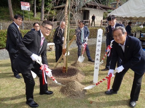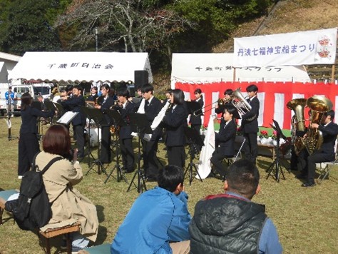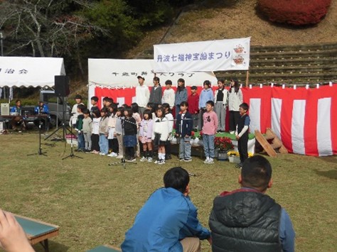 亀岡高等学校吹奏楽部の演奏や地元小学生による合唱などで華やかに開会しました。また、この「七福神まつり」は亀岡市制70周年及び千歳町自治会設立70周年記念事業として開催し、記念植樹としてしだれ桜を会場の七谷川野外活動センターに植樹しました。