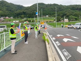 秋の全国交通安全運動(令和7年9月21日~9月30日)期間中の9月24日(水)早朝に交通安全の街頭啓発を行いました。この取組は、令和2年2月に府道亀岡園部線千歳北工区が開通し、大幅に交通量が増加したことにより交通事故の発生が懸念されることから、春と秋の全国交通安全運動に合わせて通行車両のドライバーに安全運転を呼びかけようと始めたものです。当日は、千歳町安全・安心のまちづくり推進会議の防犯・交通・防災安全部会メンバーと区長、自治委員、亀岡警察署、市役所自治防災課の参加をいただきました。